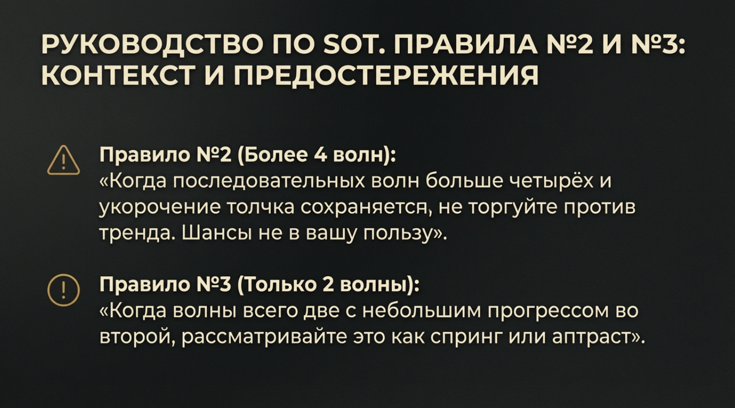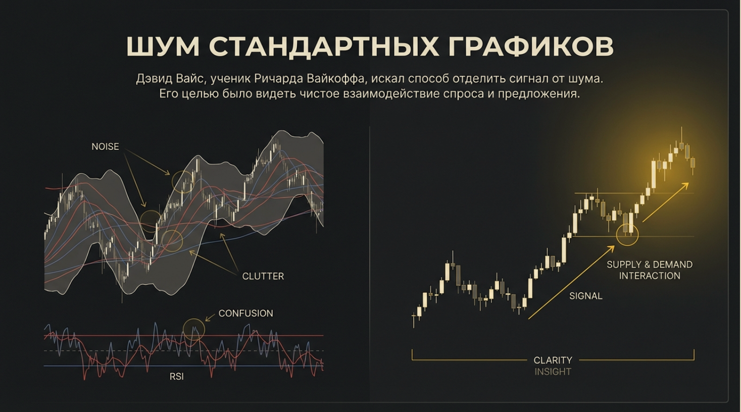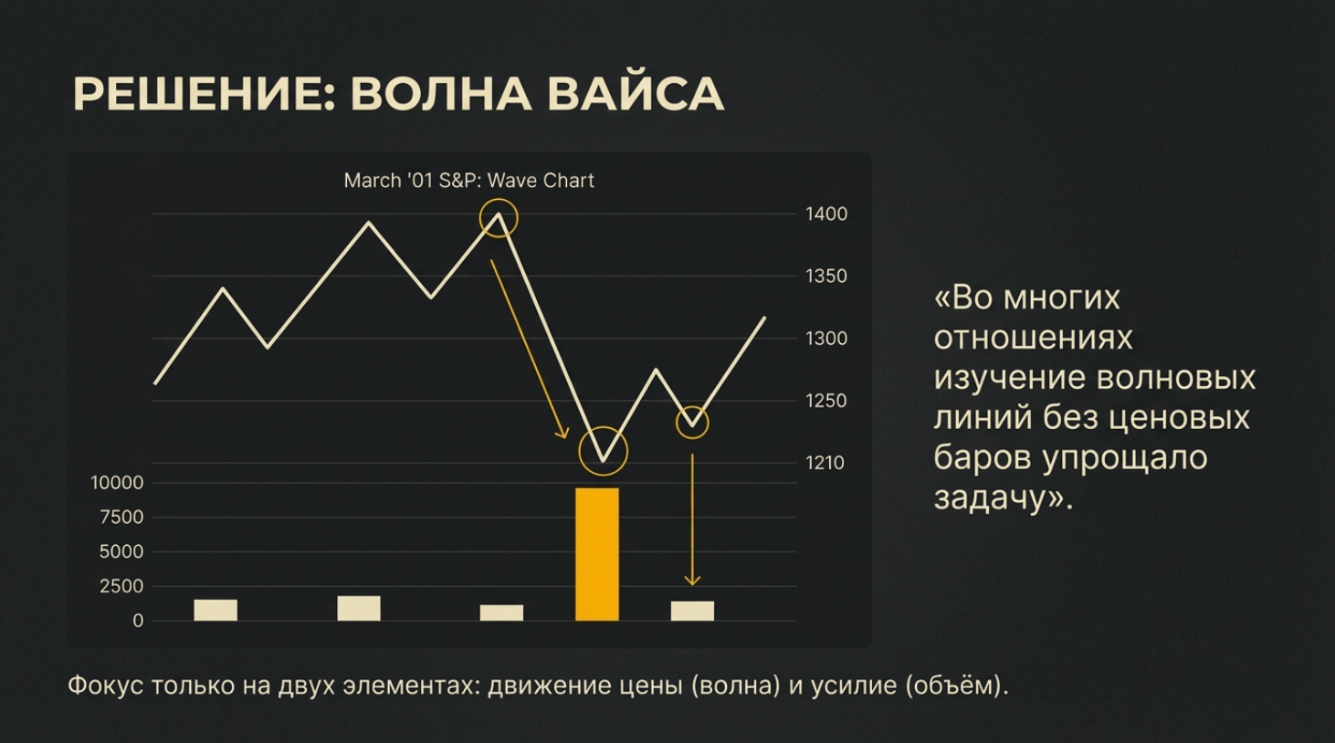 • Усилие без Результата: Огромный объем на волне, но длина волны (прогресс цены) маленькая. Это признак поглощения или встречи лимитных ордеров.