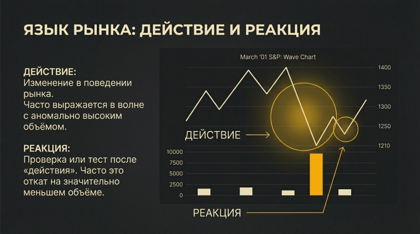 1. Действие: Появляется аномально большая волна объема против текущего тренда. Это самое большое усилие за долгое время [13, 14].