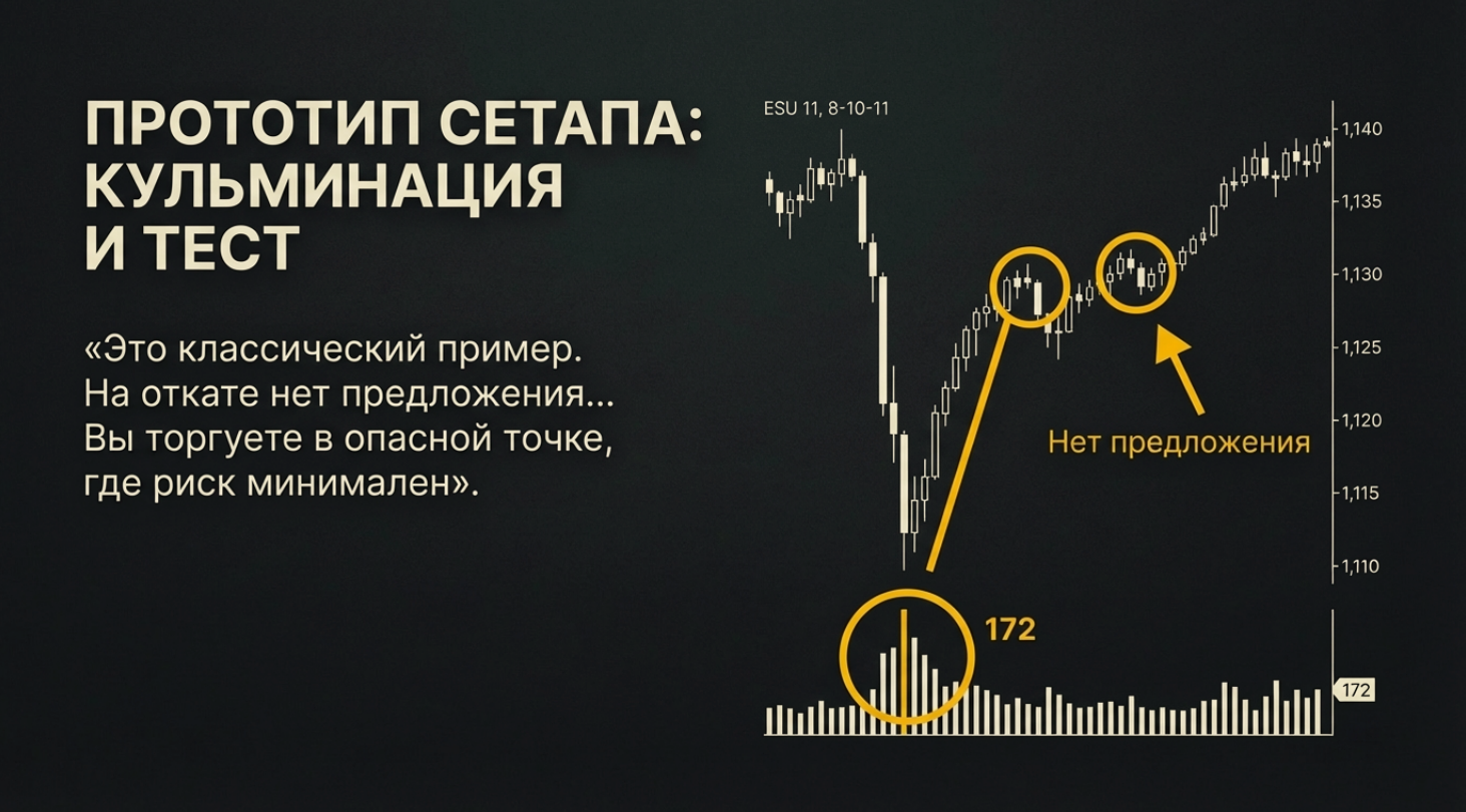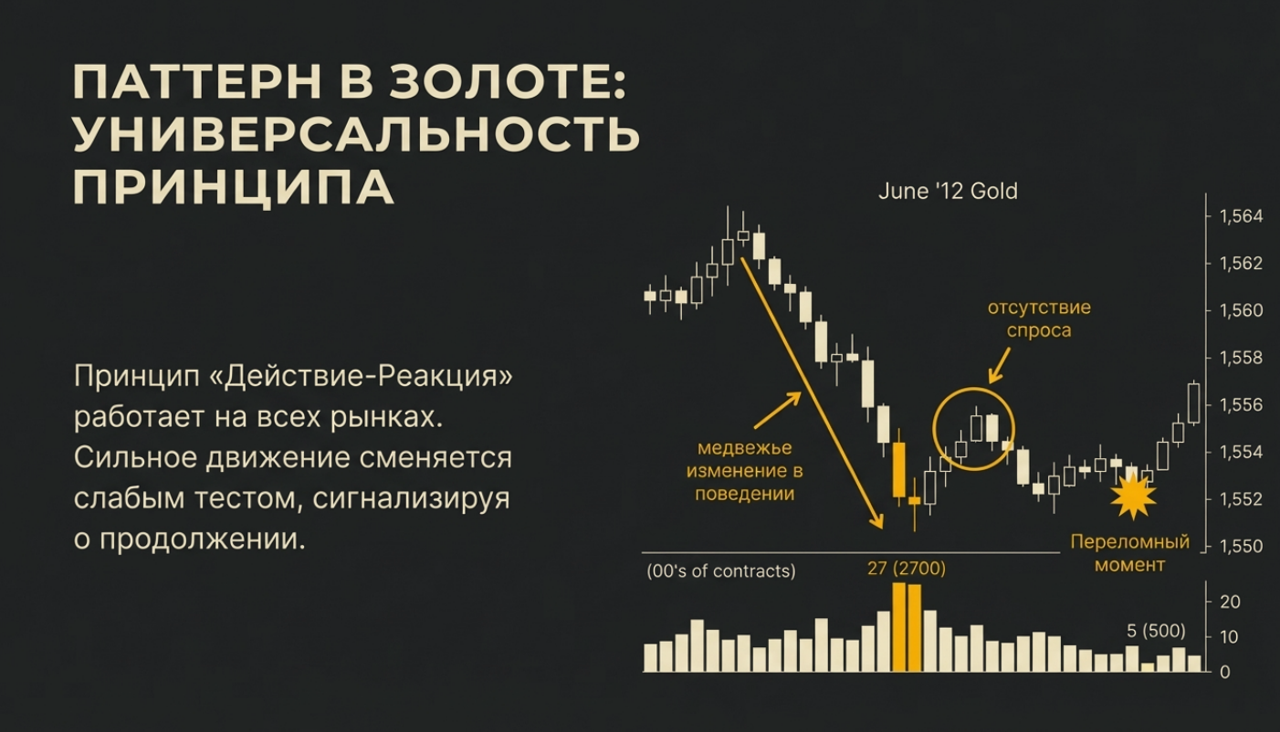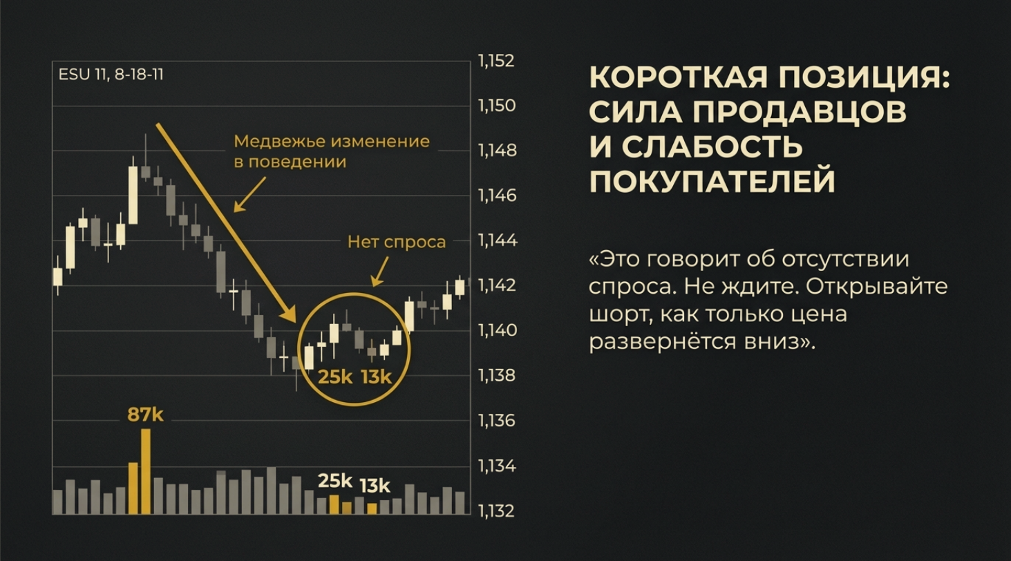 2. Реакция (Вход): Следующая волна отката имеет крайне малый объем. Это говорит об отсутствии интереса двигать цену обратно («No Demand» или «No Supply»).
