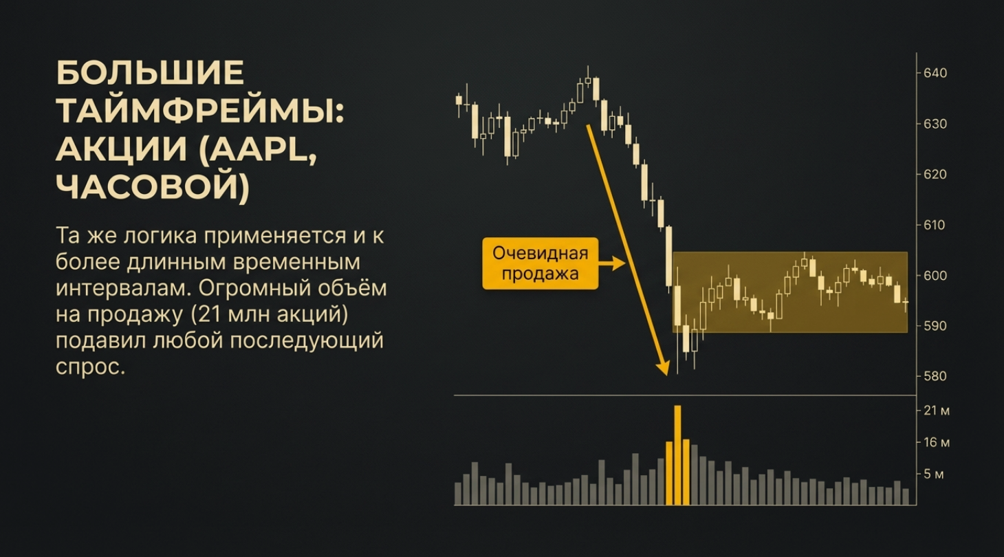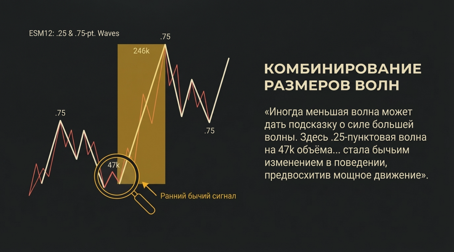 • Цифровое чтение ленты: Это современный аналог чтения тикерной ленты, о котором писал Вайкофф. Мы видим «борьбу» в чистом виде, суммируя каждую сделку внутри движения.