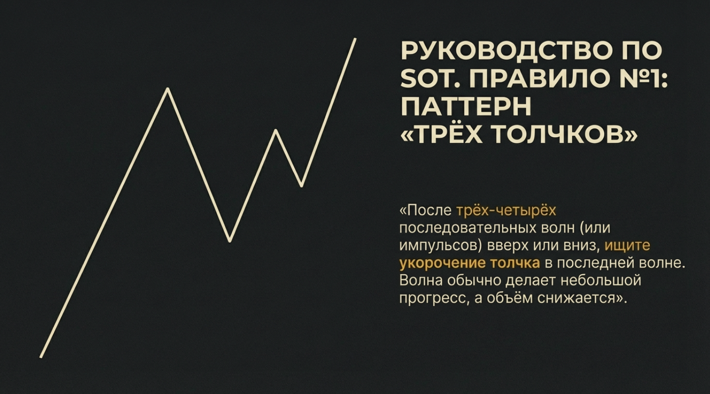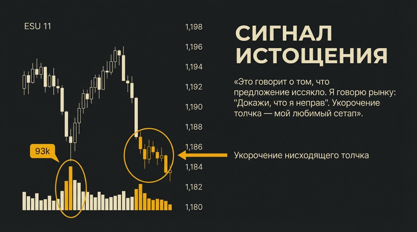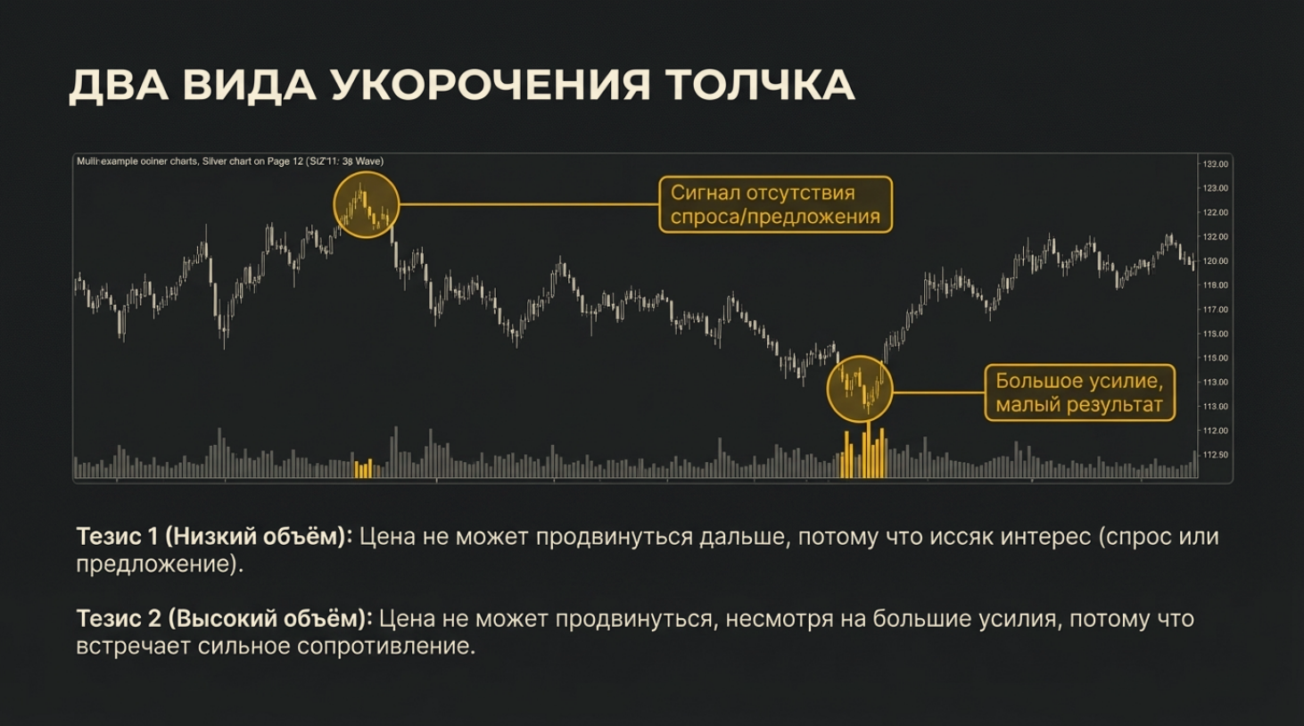 2. Сигнал: Последняя волна делает перехай/перелой, но она короче предыдущих, а объем на ней падает (или объем высокий, но прогресса нет). Это дивергенция цены и усилий.