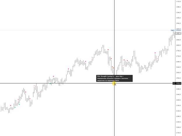 Индикатор рисует зелёные стрелки под барами, когда видит классические признаки силы (SOS — SignsofStrength) в терминах Тома Вильямса и VSA: