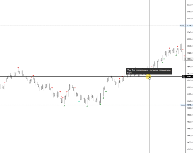- На одном из этих баров вы входите в шорт/фиксируете лонг, стоп за локальным максимумом.