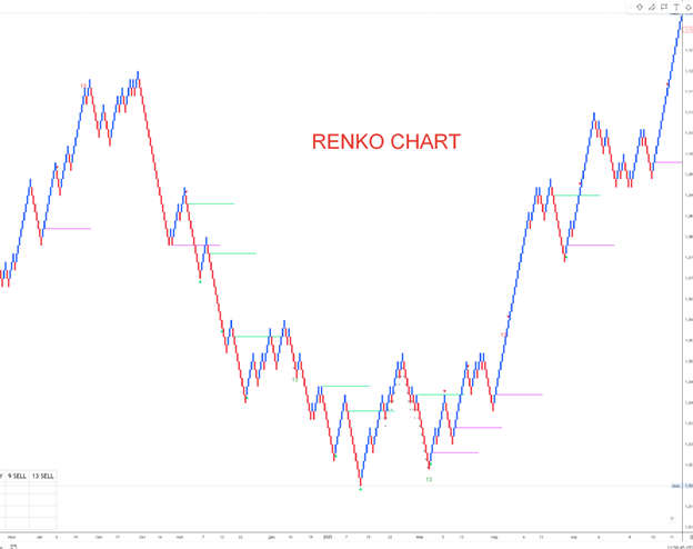 - TDCountdown (1–13) — отслеживает сколько раз рынок “ударился” в экстремумы, продолжая тренд.